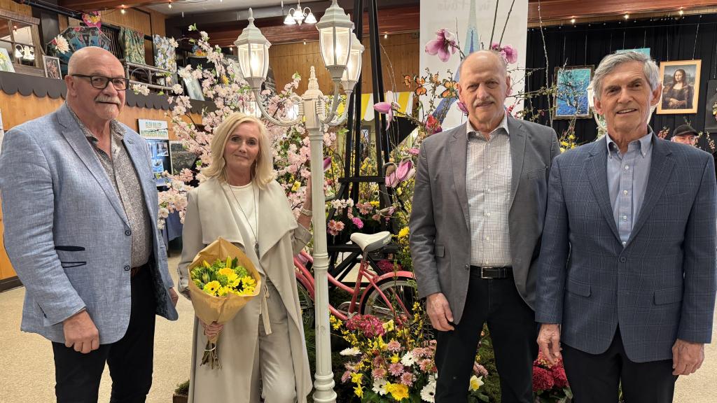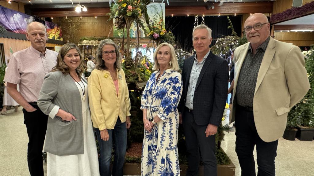 Mayor Siemens and Councillors Barkman, Driessen, Loewen and Ross with Flower Show chairperson Pauline Isherwood at the 96th annual Bradner Flower Show.