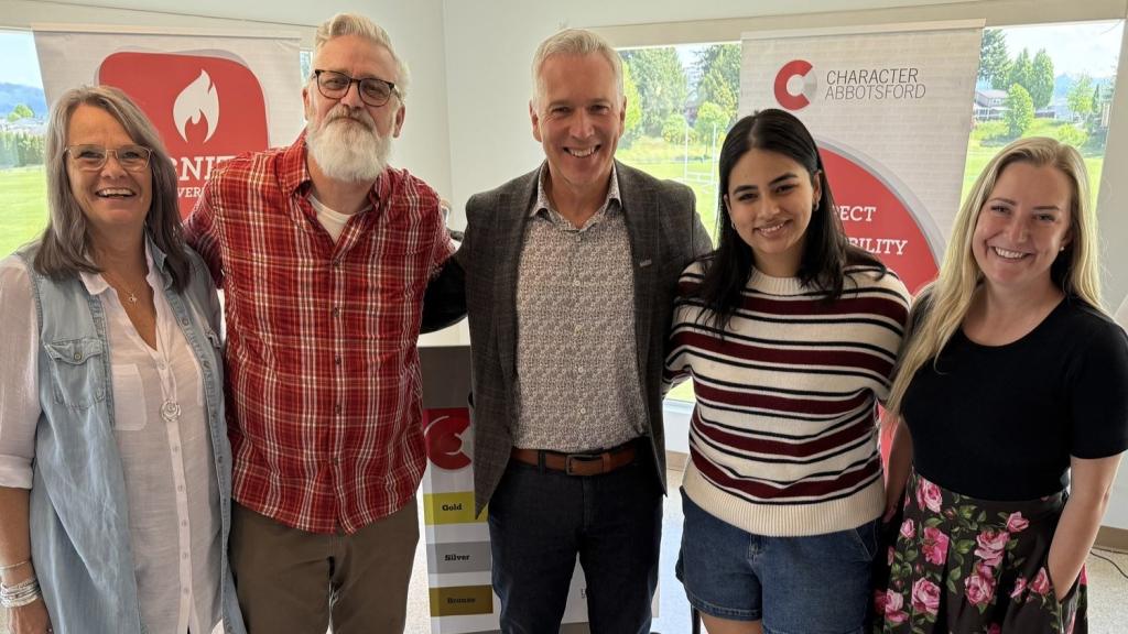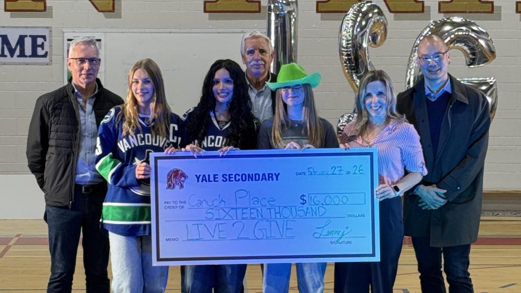 This year Yale Secondary School’s Live to Give campaign raised $16,000 for Canuck Place. Mayor Siemens, school board chair Stan Petersen and superintendent Nathan Ngieng attended the celebration, where student MCs Clara Thiessen, Kareena Sandhu and Hannah Zimmerman presented a cheque to Chantelle Bowles, Canuck Place senior officer, major gifts.
