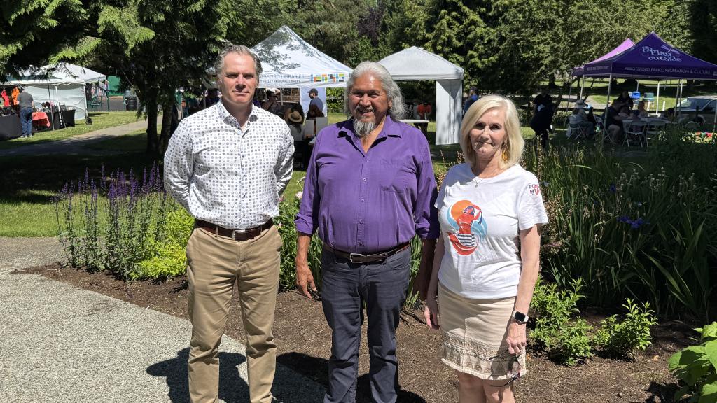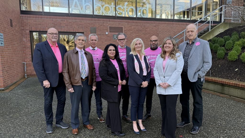 Mayor Siemens and Councillors Driessen, Chahal, Gibson and Barkman (Warkentin and Sidhu not pictured) joined Premier Eby, Ministers Ma and Alexis, Semá:th Councillor Ganzeveld and volunteers for a $76.6M funding announcement.