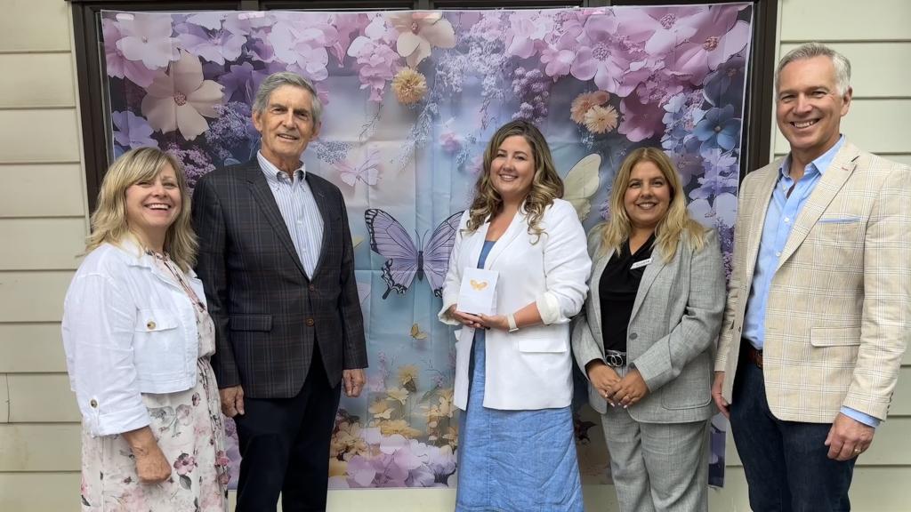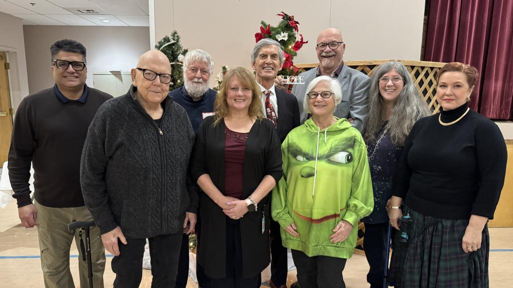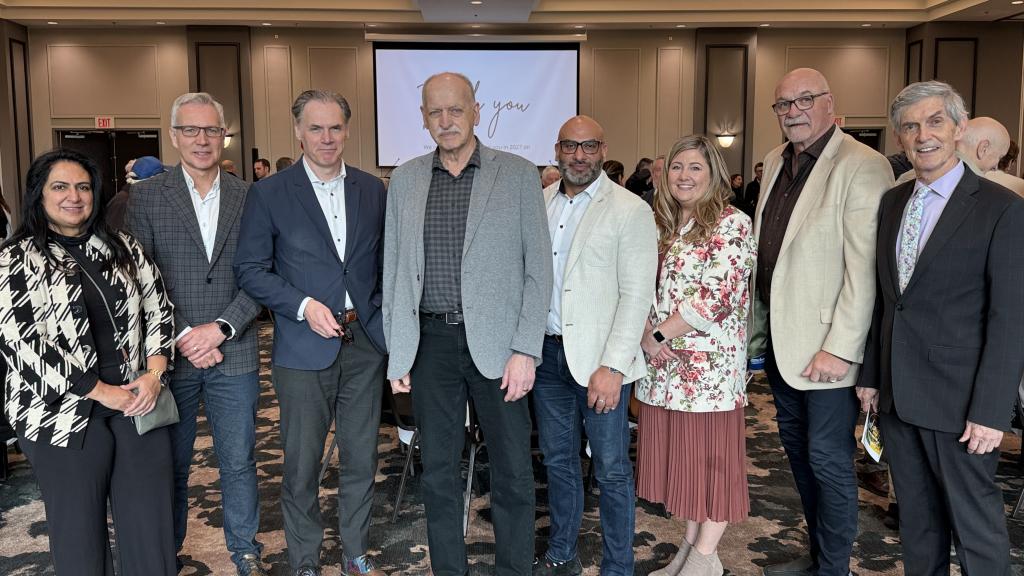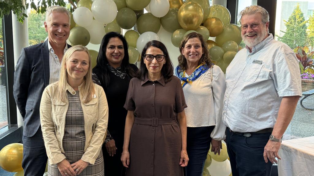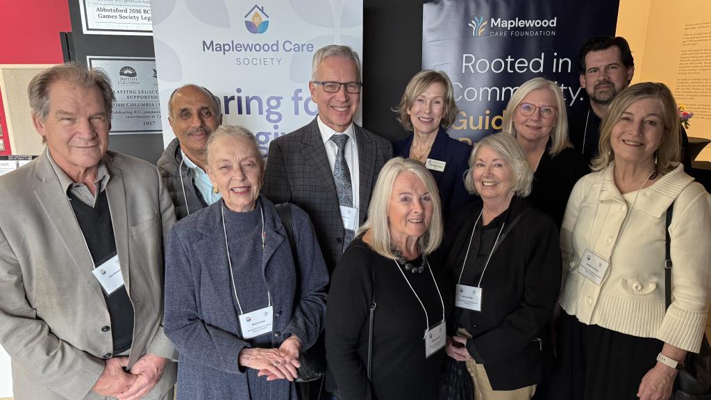 Mayor Siemens with Maplewood Care Society and Foundation CEO Ann Marie Leijen (on his left) and board members John Pankratz, Sukh Sidhu, Marion Keys, Wynne Smith, Bonnie Millin, Betty Poettcker, Brandon Kelley, and Dr. Shelley Canning (from left) at a reception announcing the launch of the new Maplewood Care Foundation.