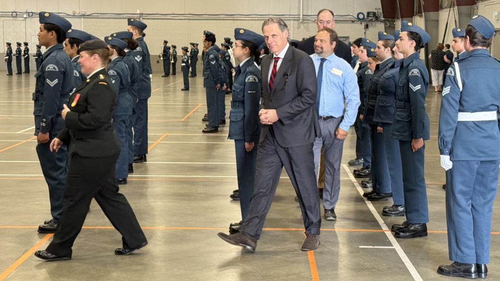 Mayor Siemens posed with members of the Snowbirds during their trip to Abbotsford.