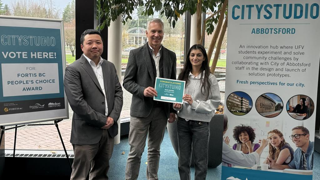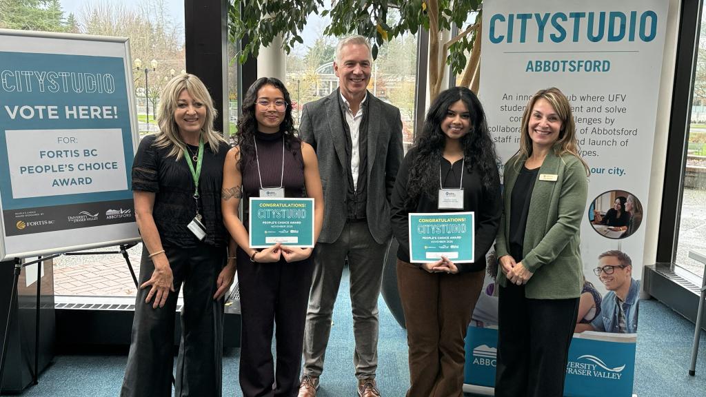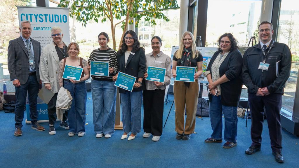 Mayor Siemens presented awards to the winners of the 13th CityStudio Hubbub. The UFV student projects covered range of topics related to accessibility, climate change and commercial truck parking.