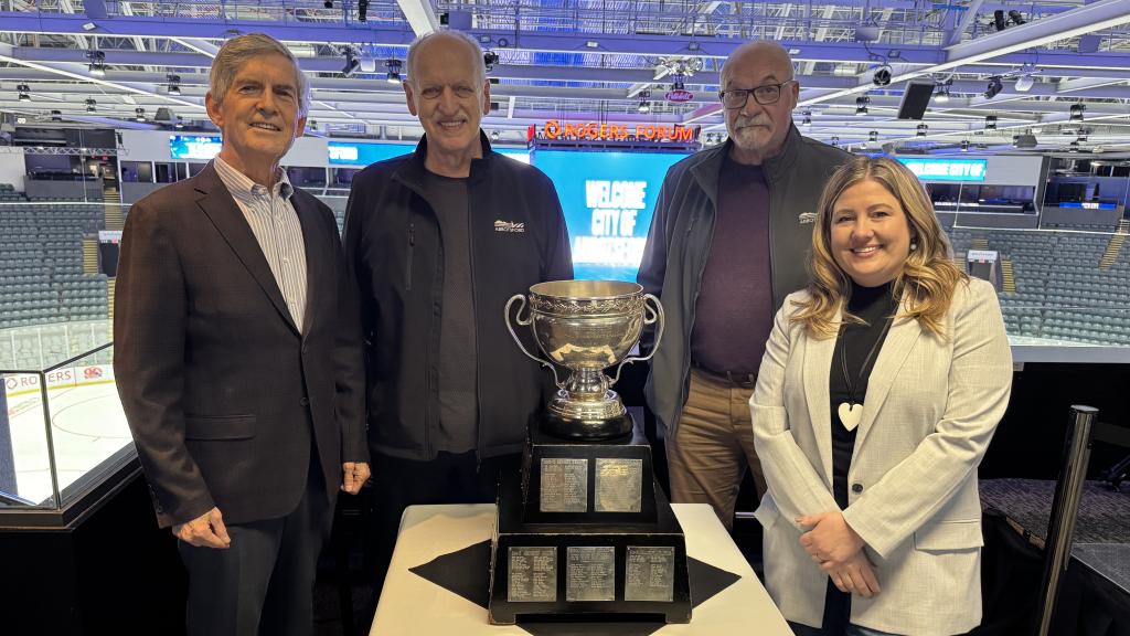 Councillors Gibson, Loewen, Barkman and Driessen with the Calder Cup during their Business Spotlight tour of Rogers Forum.