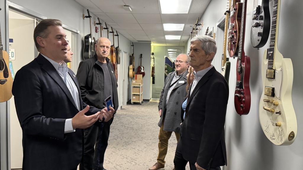 Abbotsford Canucks Chief Operating Officer Jim Kozak leads City staff and Councillors through the Abbotsford Canucks offices, which feature a collection of guitars signed by musicians who have performed on the Rogers Forum stage.