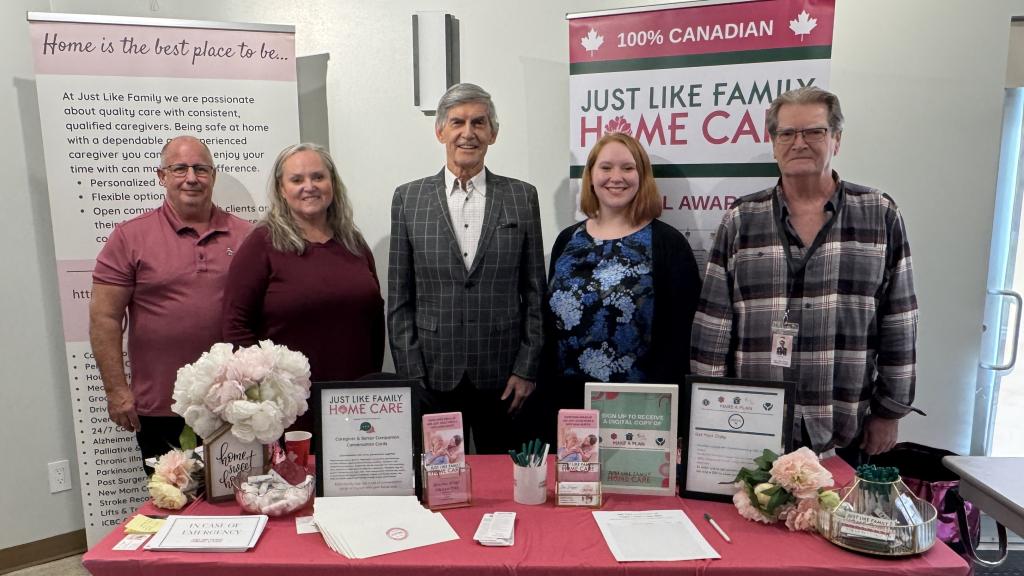 Deputy Mayor Gibson with Garth and Lisa Huppee, Brittany Wilson and Bill Klassen from Just Like Family Home Care, organizers of the Abbotsford Seniors Expo. Councillor Driessen (not pictured) also attended.