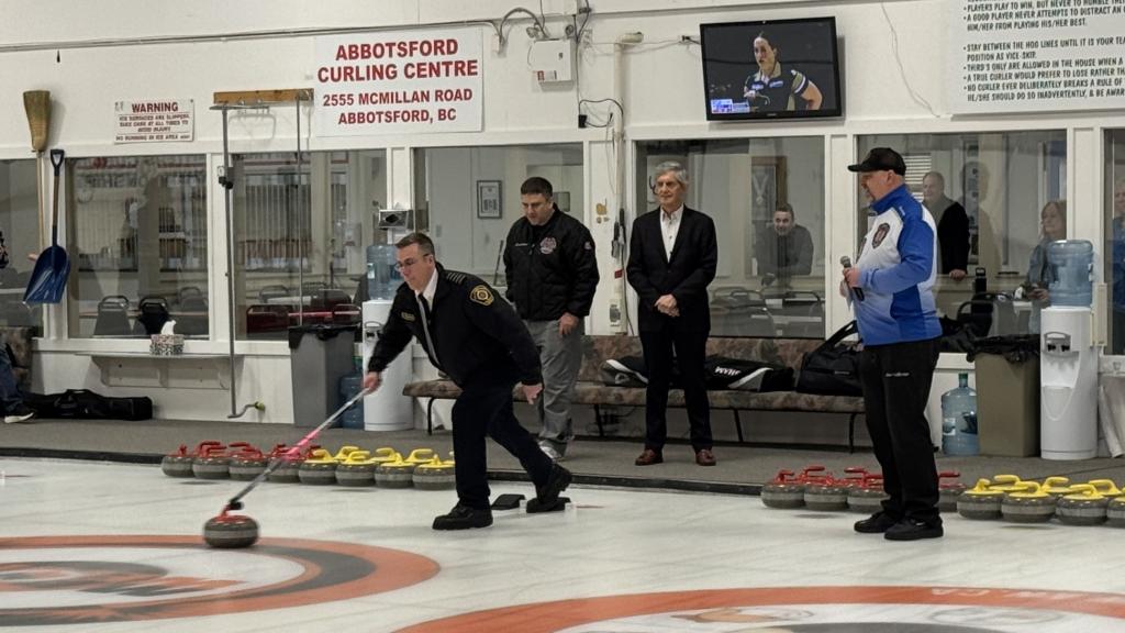 Deputy Mayor Gibson, AFRS union president Shane Petrie and BC Firefighters Curling Association president Kevin Maxwell look on as Abbotsford Fire Chief Peterson throws the tournament’s ceremonial first stone.