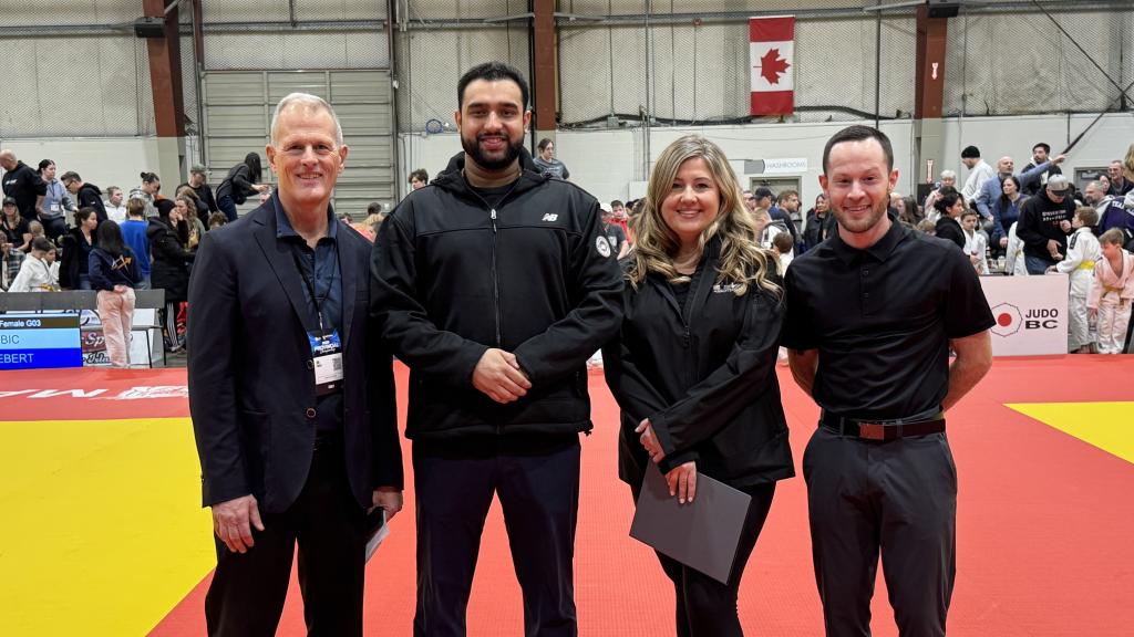 Deputy Mayor Driessen with Judo BC president Ian Briggs, MP Gill and Abbotsford Judo Club head instructor Layton Keely. Councillor Barkman (not pictured) was also in attendance.