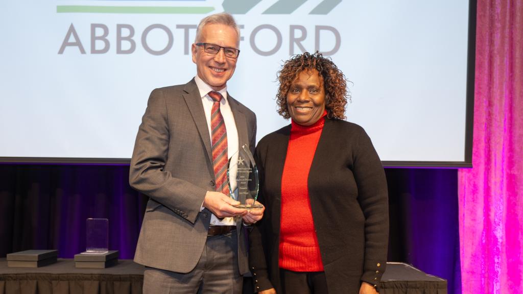 Mayor Siemens presented the 2026 Champion of Diversity Award to Mennonite Central Committee BC homelessness prevention and outreach coordinator Jane Njogu.