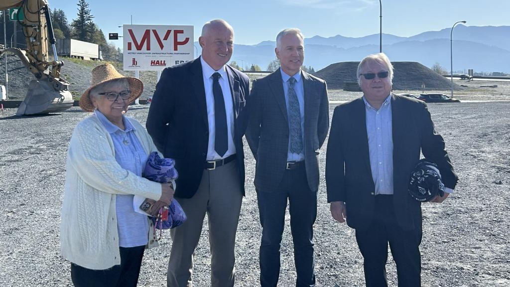 Mathxwí First Nation Chief Alice McKay, BC Transportation and Transit Minister Mike Farnworth, Mayor Siemens and Semá:th First Nation Chief Dalton Silver at an announcement for major construction starting on the new Highway 11 interchange, which is expected to reduce congestion, speed up travel times and improve safety.